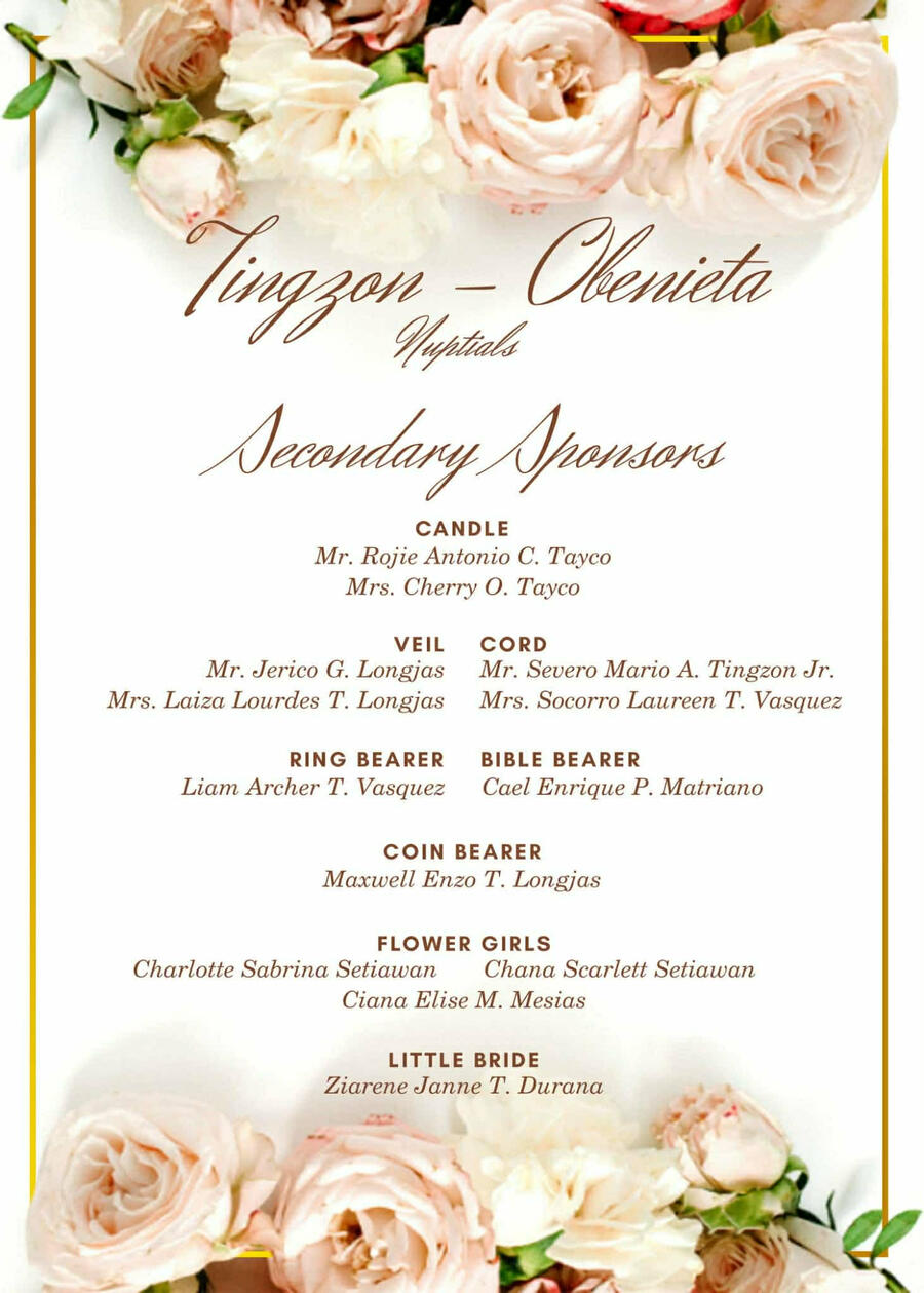 With heartfelt thanks to our cherished Secondary Sponsors, join us in celebrating DJ and Edson's joyous union, woven with love's enduring threads and faith's gentle embrace.